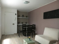 Departamento de una recámara con cama matrimonial, baño con cancel de cristal, mosaico y agua caliente; equipado con cocineta y electrodomésticos, sala con sofá cama, TV con cable SKY y comedor para 4 personas.
